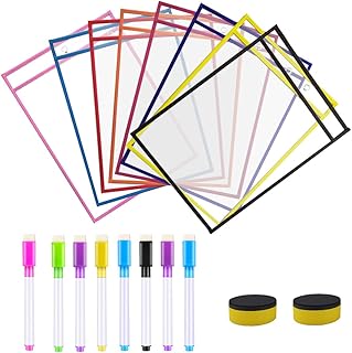 8 Pièces Effaçable à sec Poches Drap Manches,Pochettes Effaçables à Sec Réutilisables,Réutilisables Effaçables à sec avec Stylos Effaçables pour Fournitures de Bureau et D'enseignement