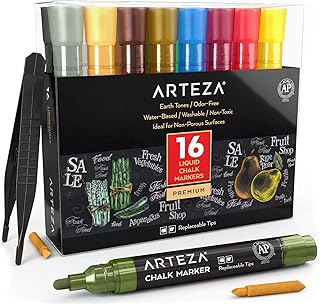 Arteza Lot 16 marqueurs craie liquide | 16 couleurs pastel | 16 pointes biseautées de rechange| 1 pince | 50 étiquettes | 2 pochoirs adhésifs | Feutres tableau blanc effaçable | Feutres enfant adulte
